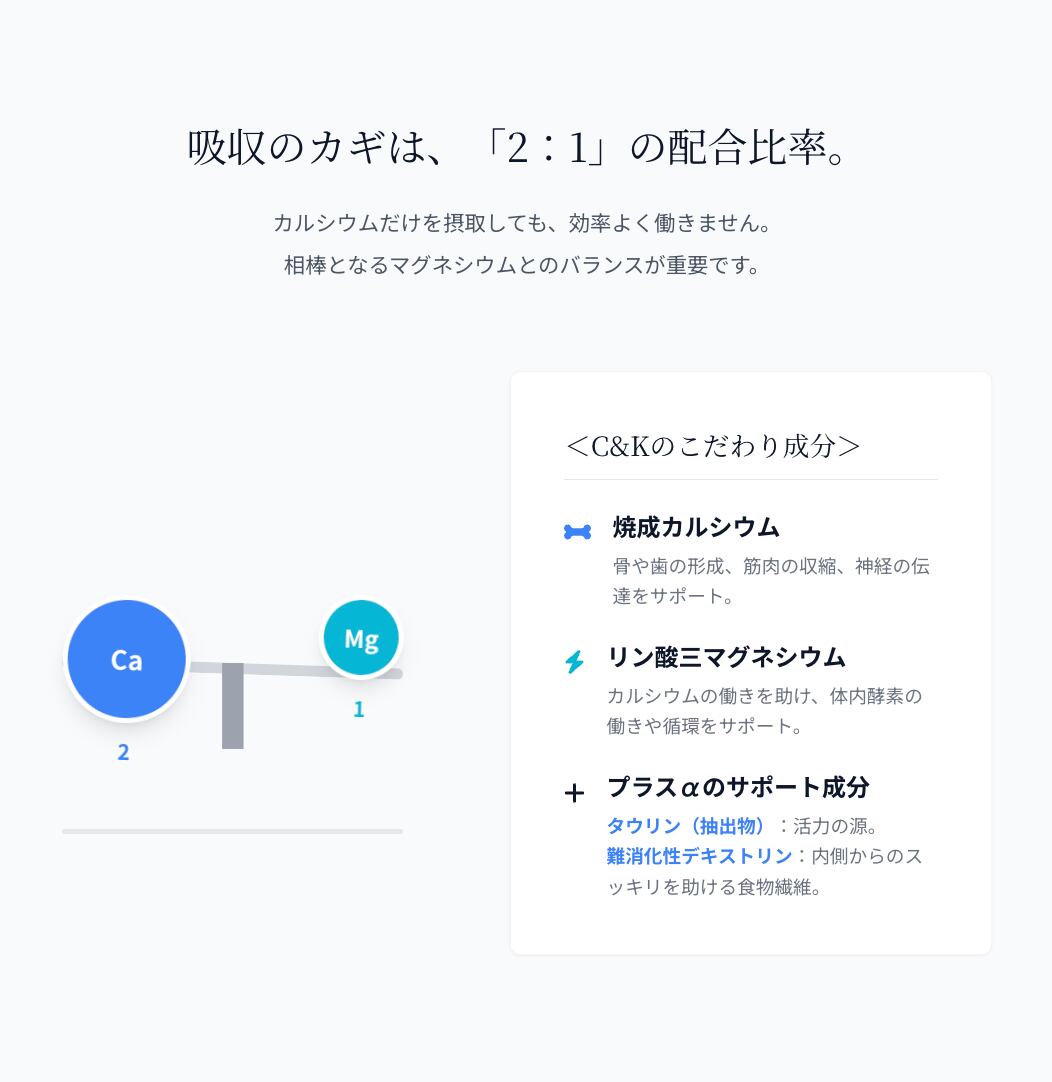 本商品はカルシウムとマグネシウムを理想的な2:1の割合で含んでおり、タウリン(抽出物)、難消化性デキストリン、還元麦芽糖も配合されています。